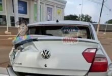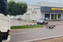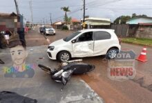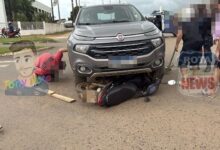 Picape para em cima de motoneta após acidente na avenida Paraná, em Vilhena