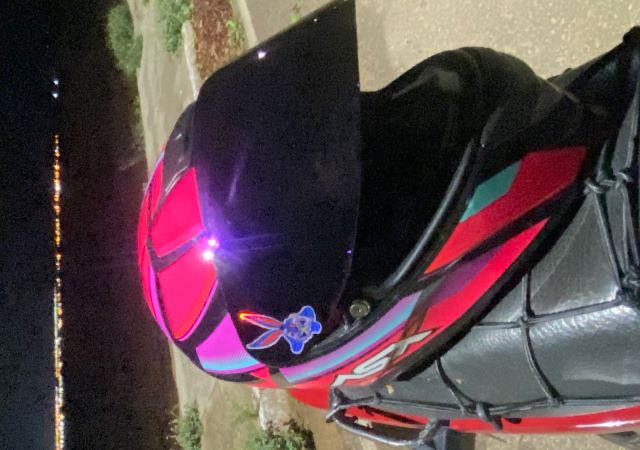 Quando retornou, percebeu que o capacete, nas cores rosa e roxa e com características marcantes, havia desaparecido.