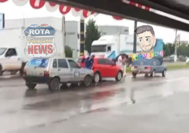 Durante a manobra, o motorista acabou forçando os veículos que trafegavam ao lado a pararem bruscamente, o que resultou na colisão entre três veículos.