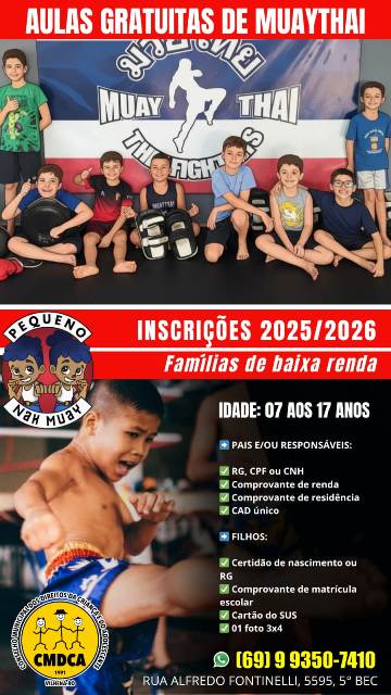 A Associação Vilhenense de Muaythai anunciou a abertura de 50 vagas gratuitas para o projeto “Pequeno Nak Muay”, voltado à formação esportiva e social de crianças e adolescentes entre 7 e 17 anos. As inscrições já estão abertas para os anos de 2025 e 2026, oferecendo uma oportunidade única de acesso gratuito à prática do Muaythai — uma arte marcial tailandesa que combina técnicas de socos, chutes, joelhadas, cotoveladas e projeções.