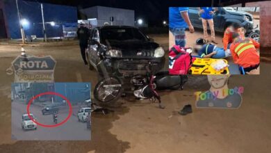 Vídeo mostra momento de colisão entre carro e moto em Vilhena que deixou mulher com possível fratura na perna