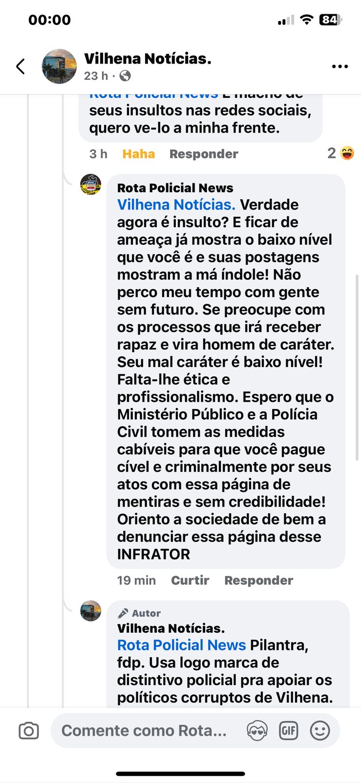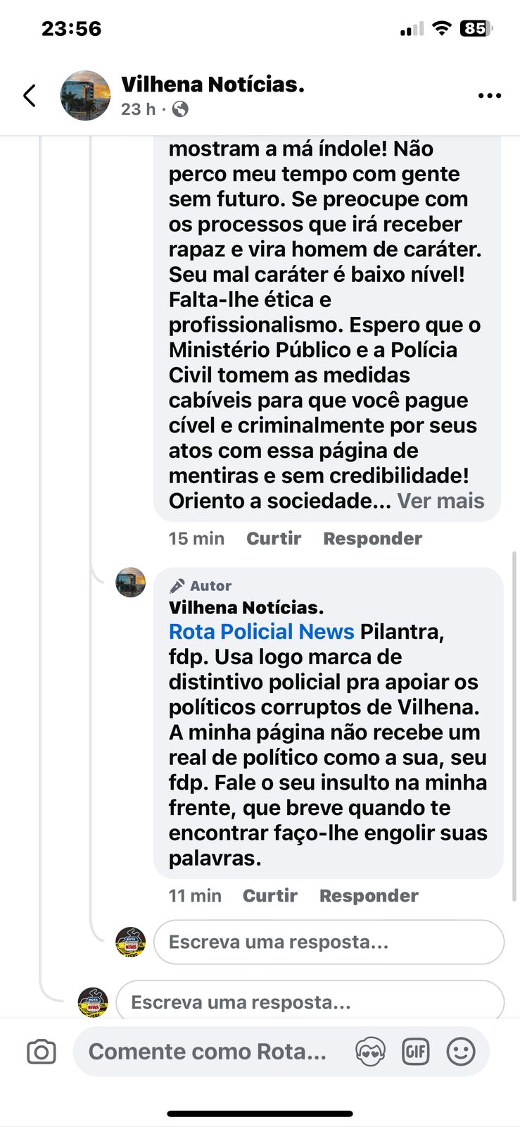 Na noite desta quinta-feira, 27 de Fevereiro, eu Antonio Carlos da Silva Santos, através da minha página no Facebook denominada “Rota Policial News” sai em defesa da jornalista e empresária Mariane Canedo Gabriel, inscrita sob°a DRT 1909/RO, que teve o nome do seu jornal usado em uma página fake que vem sendo utilizada para publicações de matérias falsas do tipo “Fake News” atacando a honra de várias pessoas na cidade. Ocorre que o infrator Neilson Ribeiro dos Santos criou uma página falsa no Facebook que pode ser encontrada no link: https://www.facebook.com/share/1Ay55ppBrE/?mibextid=wwXIfr denonimada “Vilhena Notícias” que foi plagiada por ele. Ocorre que na tarde de hoje a vítima Mariane e o vereador Eliton Costa haviam registrado ocorrência pelo fato de uma matéria falsa ter sido postada por Neilson Ribeiro na página fake “Vilhena Notícias” e após isto, os jornais locais postaram a matéria falando dos fatos e revoltado, Neilson fez uma postagem na página-fake Vilhena Notícias fazendo falsas acusações à Mariane Canedo e desta forma, sai em defesa da jornalista fazendo comentários na postagem do mesmo, informando que aquela página era “fake” e na sequencia, atraves daquela página ele respondeu com uma ameaça dizendo: “É macho de seus insultos nas redes sociais, quero ve-lo na minha frente”, tendo eu respondido a ele que tais ameaças já mostrariam seu baixo nível e que esperava que o MP e a Polícia Civil tomassem as devidas medidas. Mais uma vez, através da página “Vilhena Notícias”, ele respondeu com uma ofensa e ameaça com os dizeres: “Pilantra, fdp. Usa logo marca de distintivo policial pra apoiar os políticos corruptos de Vilhena. A minha página não recebe um real de político como a sua, seu fdp. Fale o seu insulto na minha frente, QUE BREVE QUANDO TE ENCONTRAR FAÇO-LHE ENGOLIR SUAS PALAVRAS”. Após isto, o infrator apagou os comentários da rede social, contudo, tenho os prints de toda a situação. Desta forma, devido aos insultos, a calúnia que fez ao afirmar que meu jornal recebe valores de políticos corruptos e às ameaças por ele proferidas e por sentir-se ameaçado por ele demonstro meu interesse em representá-lo criminalmente pela ameaça, calúnia e difamação. Comunico que estou a disposição para qualquer eventualidade e que tenho comigo os prints da situação.