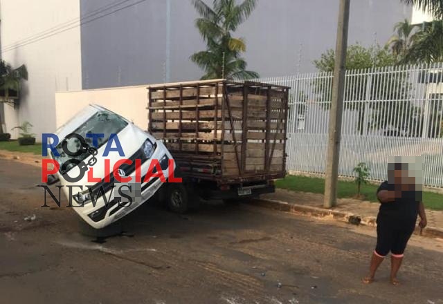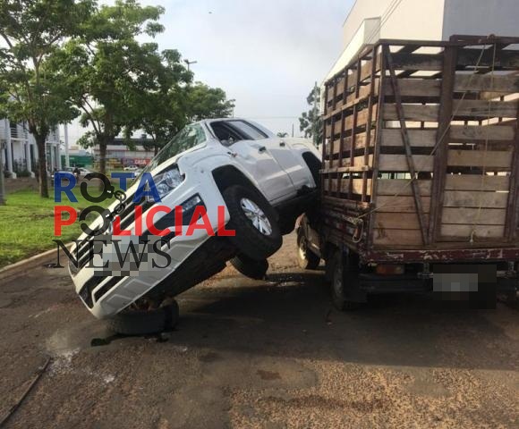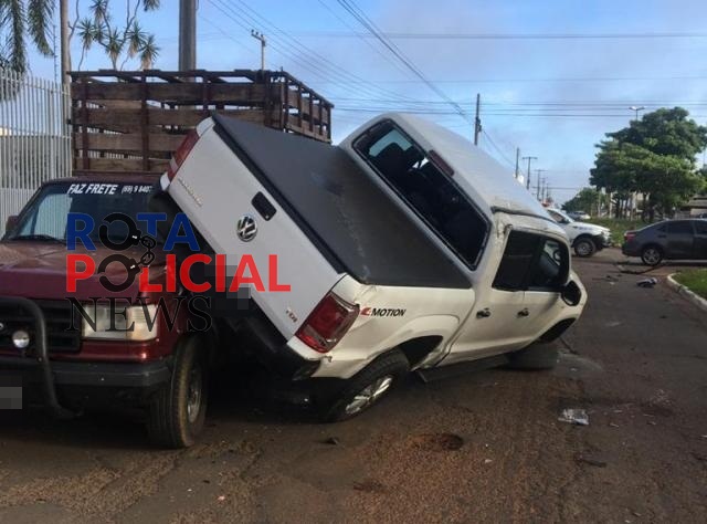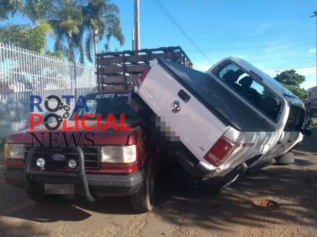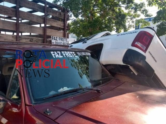 Camionete fica montada em outra após acidente de trânsito em Vilhena