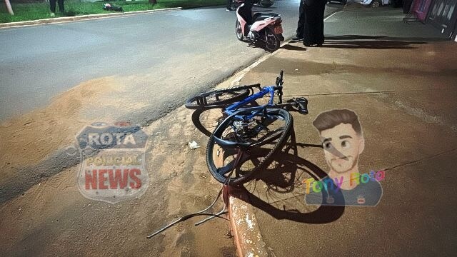Na noite desta quinta-feira, 23 de outubro de 2025, uma colisão entre uma motocicleta Honda CG Titan, de cor prata, e uma bicicleta Lotus, de cor azul, foi registrada na avenida Paraná, em Vilhena (RO).