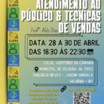 O curso “Atendimento ao Público & Técnicas de Vendas” será realizado entre os dias 28 e 30 de abril, na Câmara Municipal de Vilhena, no período noturno, das 18h30 às 22h30.