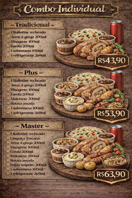 Todos os pratos principais acompanham batata assada e uma sobremesa de 100 ml, agregando ainda mais valor às refeições.