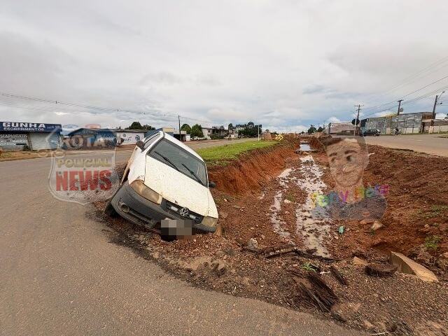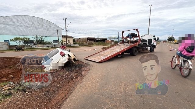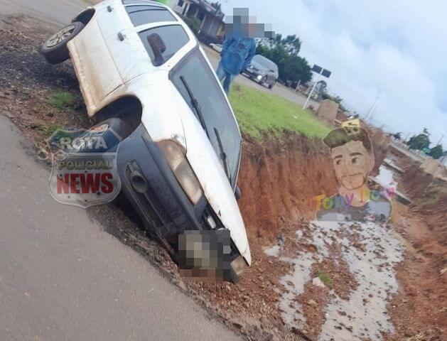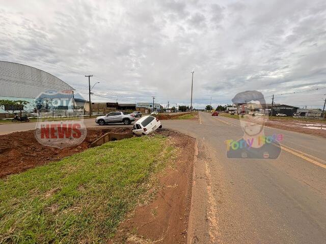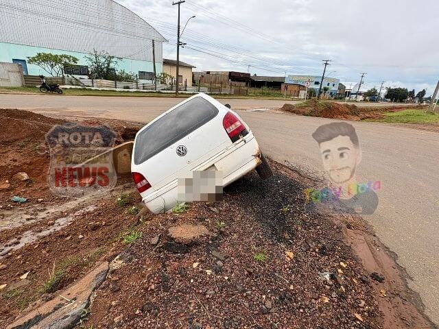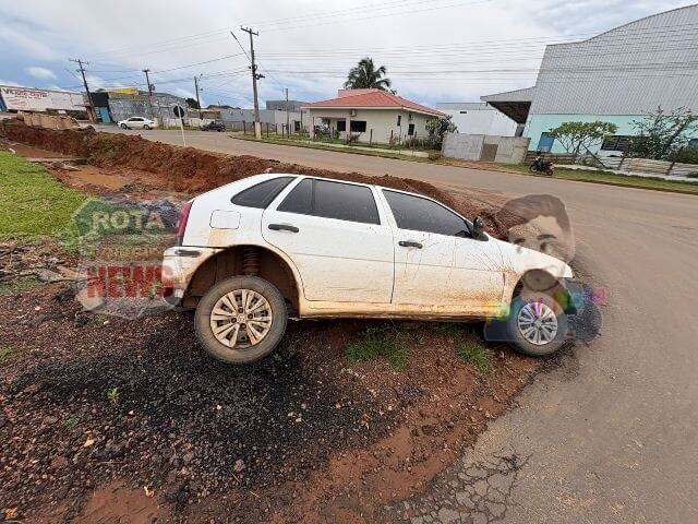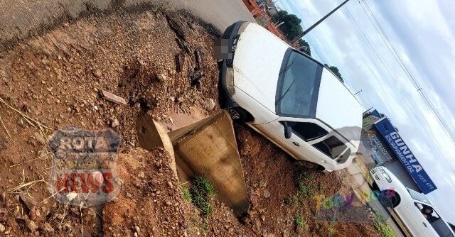 O motorista de um Volkswagen Gol, de cor branco, trafegava pela rodovia sentido Juína/MT quando, ao tentar realizar uma manobra de retorno, calculou mal o momento da conversão e acabou parando dentro de uma galeria de esgoto aberta às margens da pista.