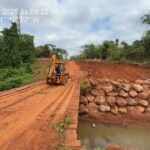 A estrutura, com 18 metros de extensão, está recebendo obras de execução das cabeceiras com rochas e a construção de uma nova ponte de madeira, garantindo mais segurança e melhores condições de tráfego para os moradores da região e para o escoamento da produção local.