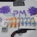 Os policiais militares abordaram, C.A.A.S. de 25 anos em um veículo no perímetro urbano e durante a abordagem, os policiais descobriram que outro indivíduo identificado pelas iniciais M.V.M.S. 20 anos teria dado dinheiro para comprar “pinos” usados para embalar entorpecentes. A casa de M.V.M.S. foi identificada como ponto de armazenamento e venda de entorpecentes.