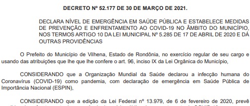 Foi publicado no fim da tarde desta terça-feira, 30 de março, novo decreto municipal que adequa as normas municipais ao decreto estadual de combate ao novo coronavírus. O decreto municipal n° 52.177 entra em vigor hoje e continuará valendo pelo menos até que Vilhena seja retirada da Fase 1 pela Secretaria de Estado de Saúde (Sesau), que manteve todos os municípios do Estado no patamar mais rigoroso de restrições através da Portaria n° 33, no último domingo, 27 de março.