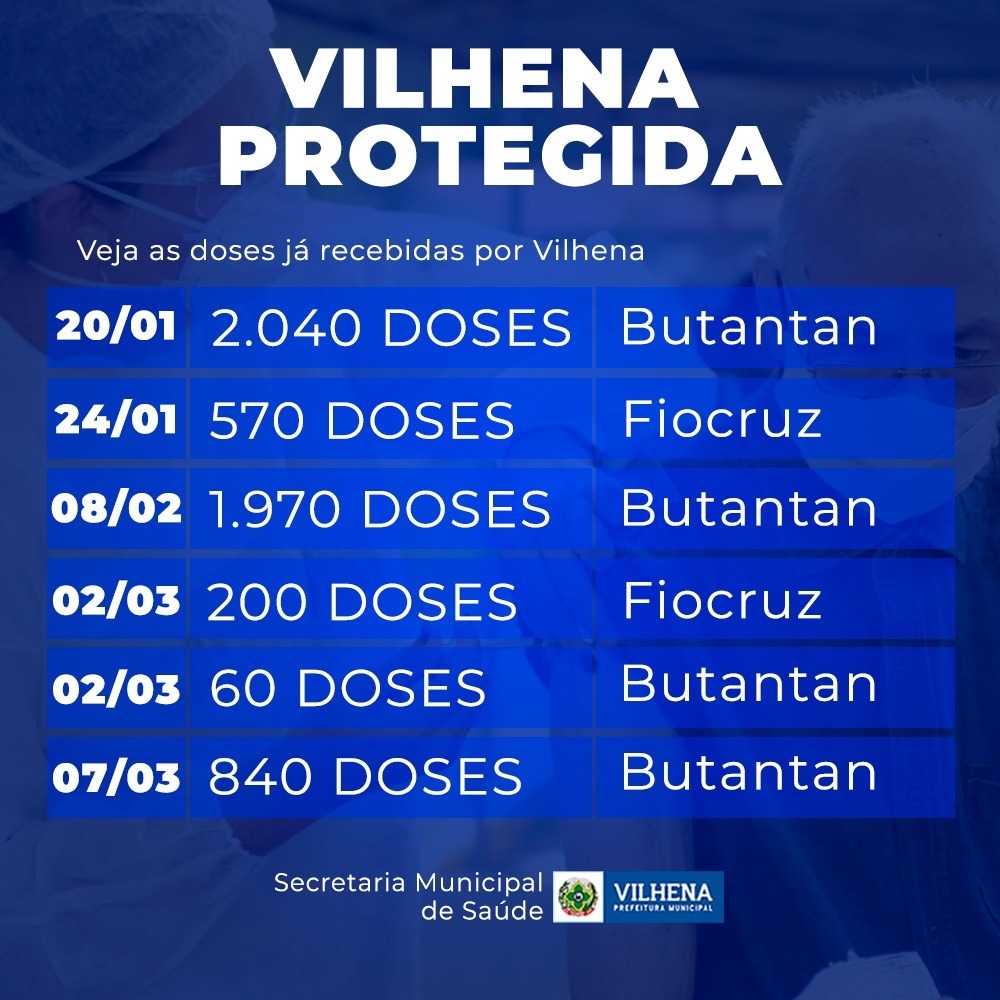 Conforme a tabela em anexo, Vilhena já recebeu 5.680 doses de vacinas contra a covid-19. As vacinas são armazenadas pelo Governo do Estado na cidade, em câmaras frias próprias e são liberadas para a Prefeitura conforme o prazo de aplicação. As do Butantan, como têm prazo de até 28 dias para a segunda dose, têm seus lotes divididos em dois e entregues à Prefeitura em duas etapas: uma para a primeira dose e outra, 28 dias depois, para a segunda dose.