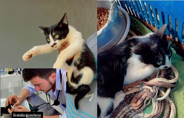 Após avaliação, o felino recebeu os primeiros cuidados e foi atendido com um grande desconto no valor do procedimento, o que possibilitou o tratamento emergencial e os cuidados necessários para recuperação.