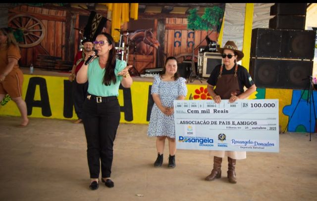 Durante o leilão da APAE de Chupinguaia, a deputada Rosangela Donadon anunciou a destinação de uma emenda parlamentar no valor de R$ 180 mil, que já está totalmente paga. A parlamentar participou da entrega de um cheque simbólico, reforçando seu compromisso com a instituição e com as famílias atendidas.