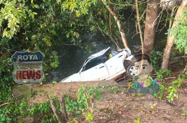 O carro capotou e foi arremessado para fora da pista, parando do outro lado da rodovia, muito próximo de cair dentro de um rio.