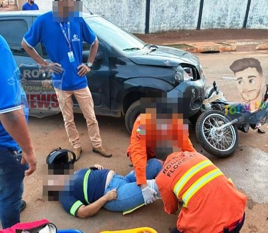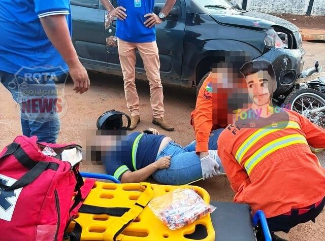 Vídeo mostra momento de colisão entre carro e moto em Vilhena que deixou mulher com possível fratura na perna