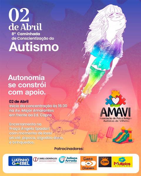 Vilhena será palco de mais um grande ato de conscientização e inclusão neste dia 02 de abril, com a realização da 8ª Caminhada de Conscientização do Autismo, promovida pela AMAVI (Associação de Pais e Amigos de Autistas de Vilhena).