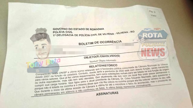 Um boletim de ocorrência foi registrado na Unidade Integrada de Segurança Pública (UNISP) de Vilhena, nstaq quinta-feira, 22 de janeiro de 2026, relatando um episódio ocorrido nas dependências da Câmara Municipal de Vereadores.